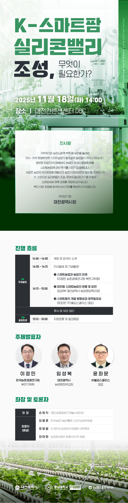 이같은 농업의 여건변화에 대응하고 농업의 미래산업화 방안을 모색하고자 ‘K-스마트팜 실리콘밸리 조성, 무엇이 필요한가?’를 주제로 스마트농업 정책 포럼을 개최하고자 합니다. 부디 이번 포럼에 참석하셔서 자리를 빛내주시기 바랍니다.