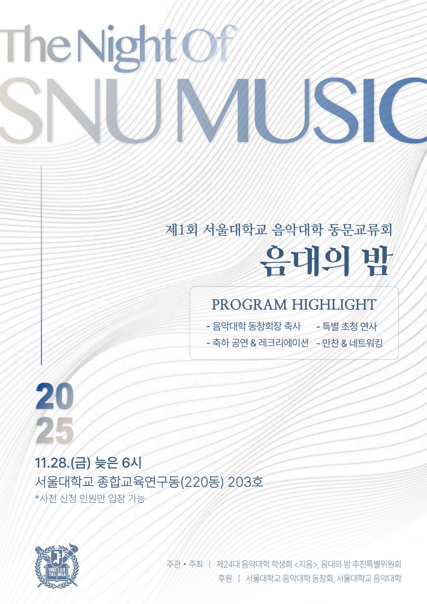 *본 행사는 서울대학교 음악대학 동문을 대상으로 진행하는 행사이므로, 동문이 아닌 가족 및 지인 분들께서는 참여하실 수 없음을 양지하여 주시기 바랍니다.